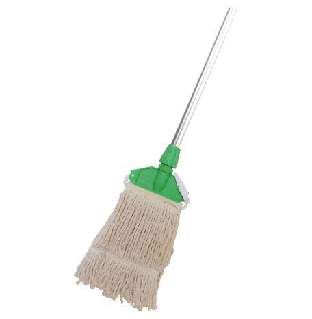 The mop is made of 75% cotton weighting 250 grams, the water absorbency is high so that the floor is not slippery, Cut End mop type so it is not easy to get snagged. Mop holder made of strong plastic material so durable, the handle is made of aluminum 150 cm, and the round shape handle of holder does not hurt the hand. Refill replacement is very easy